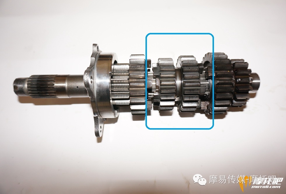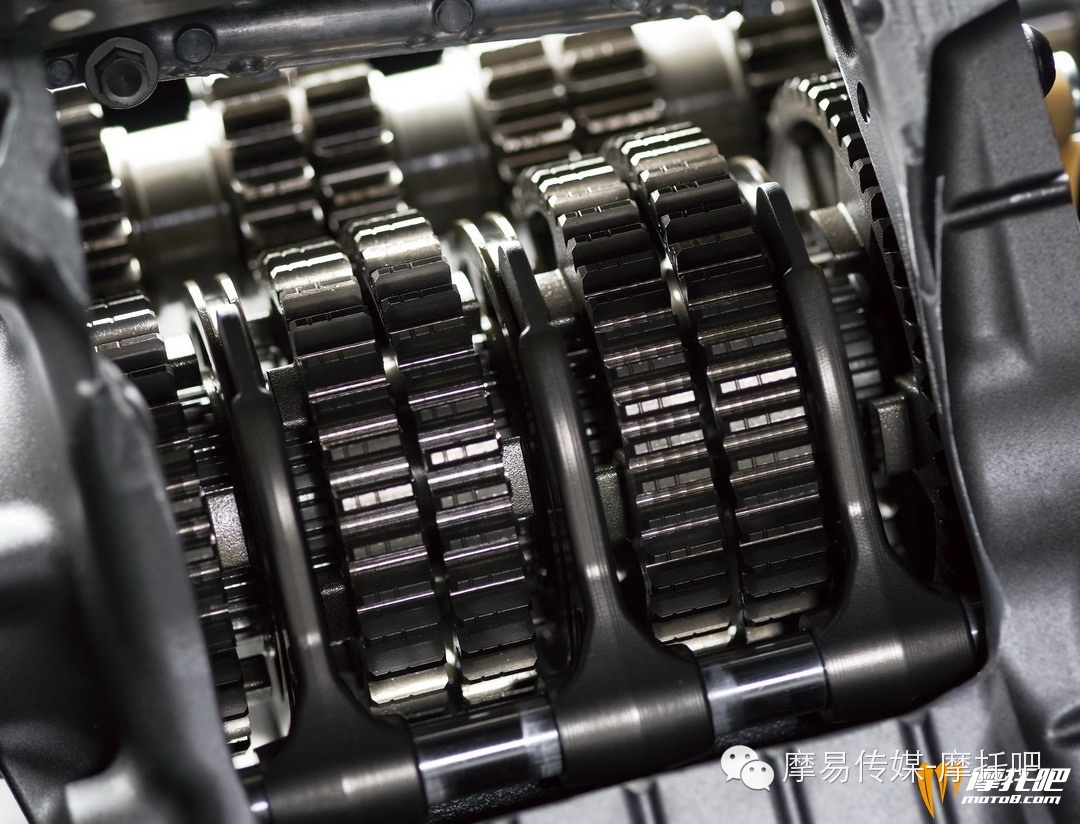 下面这张图片是R1的传统Dog Tooth齿轮箱的照片,换挡时蓝色框内的两颗齿轮左右移动,结合不同的档位;而上面的H2的Dog Ring齿轮箱,里面的齿轮是固定的,左右移动换挡的是一个打孔的环型盘。这种变速箱技术源自MotoGP赛场,在极限驾驶的情况下换挡更快,打个比方说,传统变速箱换挡所用的时间是“啪嗒”,而H2的Dog Ring变速箱换挡只需要“口”的时间,后面的“拍嗒”就不需要了!