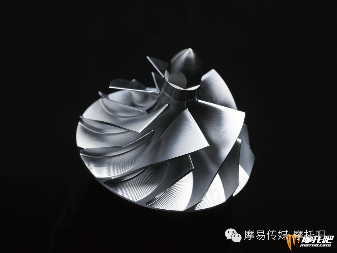 这是机械增压器的离心压缩机,由一整块锻造铝合金经过CNC切削而成。它的名称是“离心压气机叶轮”,而不是“涡轮”。