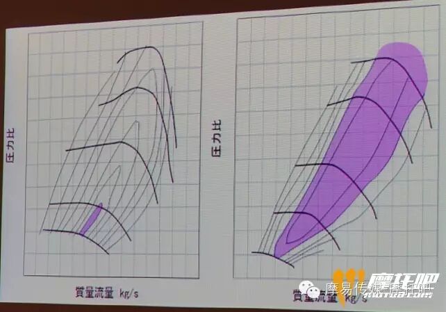 这张图是增压器的工作特性图,我们先来看较细的脊线,它代表增压器的工作效率。粉色部分代表高效率工作区域,宝贝虎个人的经验,粉色线是指90%以上工作效率。图上可以看出,左边的涡轮增压器,主要工作区域的效率在70%左右;而右侧H2的机械增压器,在整个工作区域内都能保持90%以上的效率,这是后改装增压器做不到的。