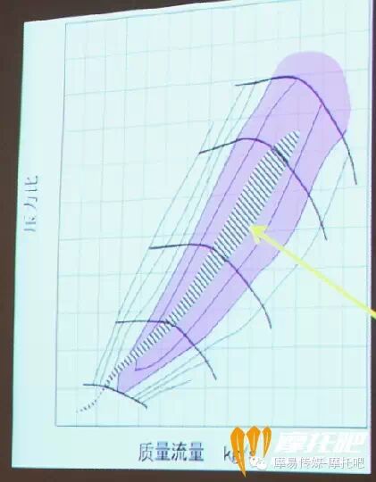 再来看涡轮与引擎的匹配度。图中较粗的黑线代表压气机的压力-流量特性。黑色线的左侧为水平横线,代表这个区域的空气流量非常充裕;黑色线的右侧为急剧下滑的斜线,代表不能维持足够压力。