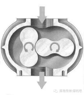 机械增压器(Super charger):由引擎的曲轴带动压气机,将空气的压力提高,压气机又有多种结构,汽车上常见的是罗茨式压气机。特点是结构复杂而紧凑,效率一般;