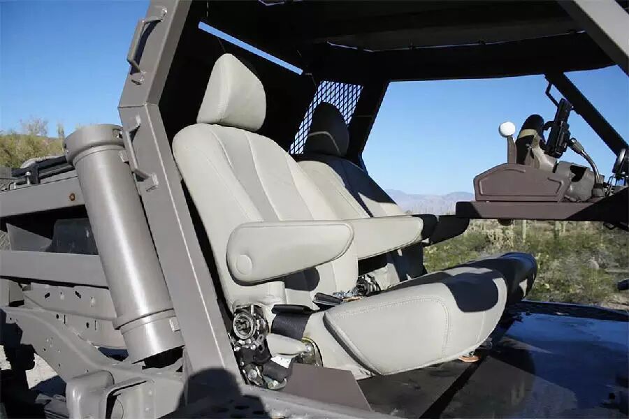 与外观一样,Rockzilla的内饰保留了简单粗犷的风格,只有两个带有扶手的真皮座椅而已。就连仪表台也被最简单的钢制结构所代替,上面只布置了方向盘和换挡杆,福特原厂的分动箱控制器得到了保留。车辆尾部带有一个相当狭小的车厢,其尺寸仅有160升左右,只能放置简单的救援或者露营设备。