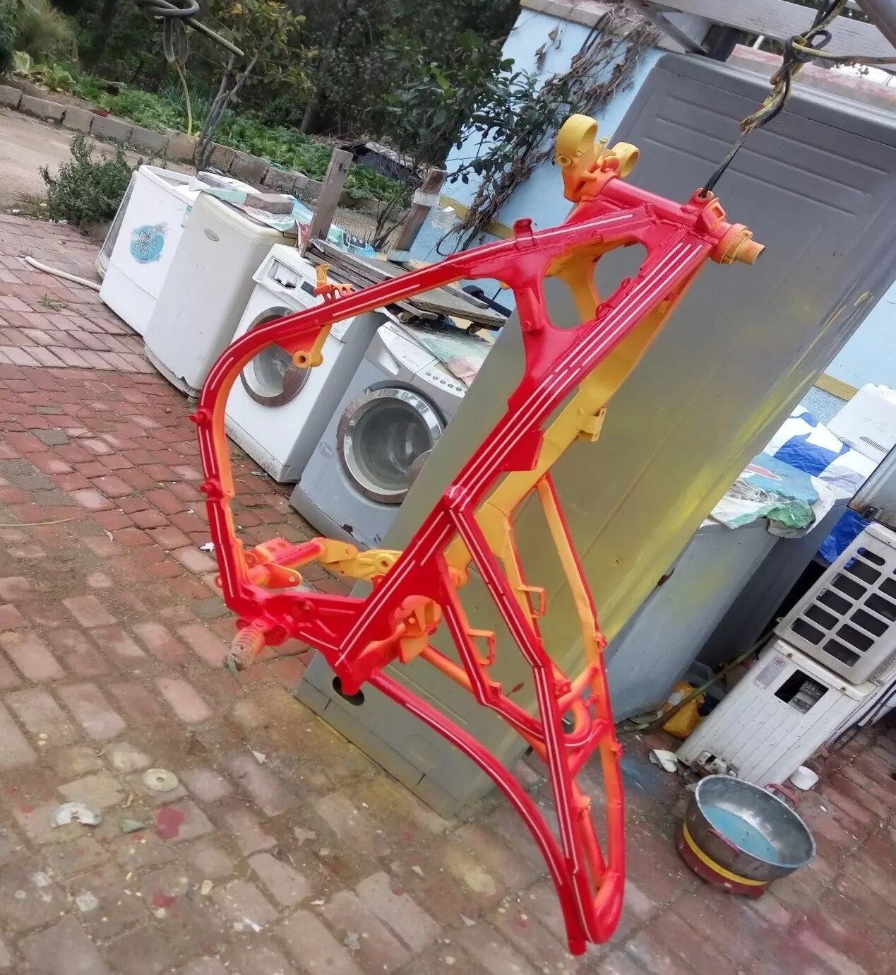 把车架部分位置涂抹一些腻子,使这些角更缓一些;这次车架更换了底漆,使用的是环氧锌黄底漆,这个漆粘结性很好。之前的灰色底漆又去喷砂厂处理干净了,喷个漆太费力了。