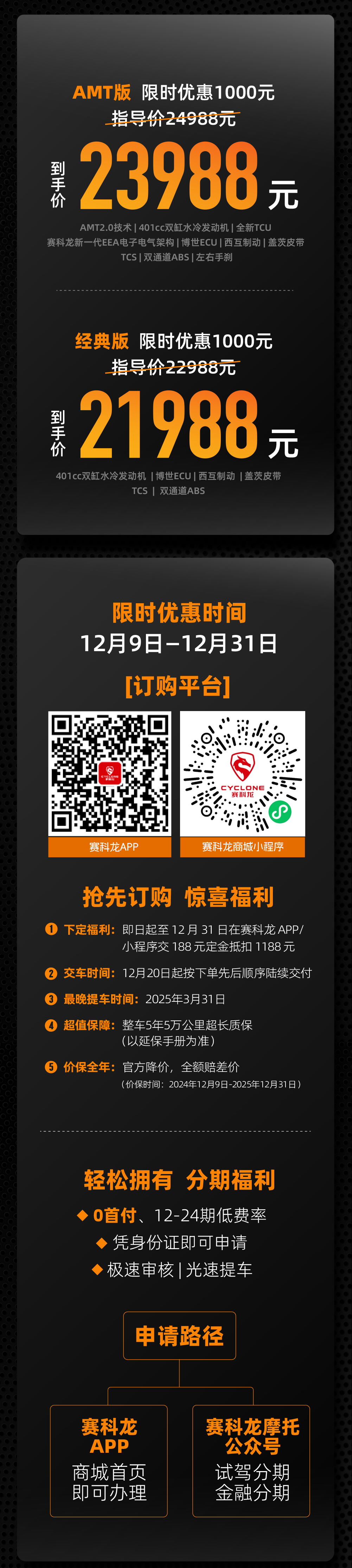 而赛科龙的AQS401不止是简单的自动换挡,是在原本基础上增强了很多,更好的硬件和更好的软件系统,通过算法能让自动换挡变得更加流畅与精准。多种选择,不仅有D档 - 自动挡,也有M档 - 拨片手动挡,在动力方面。还有E(经济模式)与 S(运动模式),两种模式可供选择。内置TCU,让软、硬件更好地配合,实时预判驾驶者的意图和车辆状态,智能调整换挡策略。超车的时候降档,稳定巡航的时候切换到经济档位。高端版的手自一体。全新一代的EEA电子电气架构,能够把TCU的指令精确的执行,忠诚可靠,保障换档动作的高效与稳定。机载T-BOX系统也焕然一新,摔车报警+主动救援功能、记录骑行路线、精准定位车辆位置、车辆状态实时查看、电子围栏、震动报警、低电压告警、疲劳驾驶警告等众多功能,一应俱全。安全配置部分也同样丰富,匹配博世电喷系统、西互制动、盖茨皮带传动、TCS与双通道的ABS,加上自动挡这些所有的配置搭载在AQS401上总价不高。多种颜色,搭配极具诚意的价格,经济下行中赛科龙与各位车主共度时艰,提供很多金融政策,以及相当的福利。 其中,整车延保5年5万公里,发动机5年5万公里质保,最令人心动。一台可以悠闲驾驶的车辆,深冬时拥有它,春天就是美丽的。 从人工,到智能,国产摩托车的探索值得肯定,赛科龙的AQS401无疑走在了前列,自动挡释放的不只是 一只手和一只脚,而是思想的方向,它正等着我们去接受!