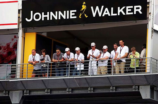 而在最近的F1赛场上,最为出名的酒品牌赞助商当属JOHNNIE WALKER。这个诞生于19世纪20年代的品牌,堪称苏格兰威士忌典范,一个行走中的绅士形象商标和“KEEP WALKING”标语令我们印象深刻。自2005年开始,JOHNNIE WALKER便展开了与迈凯轮车队的合作,它们的商标也从最早的车身侧面,逐渐转移到了两个后视镜和车手头盔上方。两个同属大不列颠岛屿的品牌,在F1赛场上联合,可谓惺惺相惜。