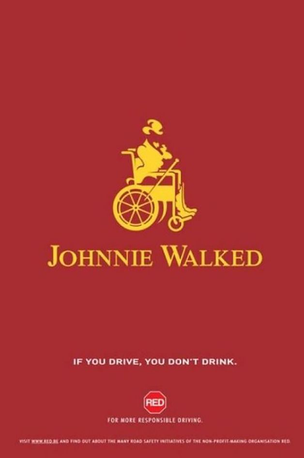尊尼获加的这幅海报也很有意思,“johnnie walker”改成了“johnnie walked”。曾经热爱生活,不停行走的johnnie变成了一个“曾经会走路的人”,因为酒驾。