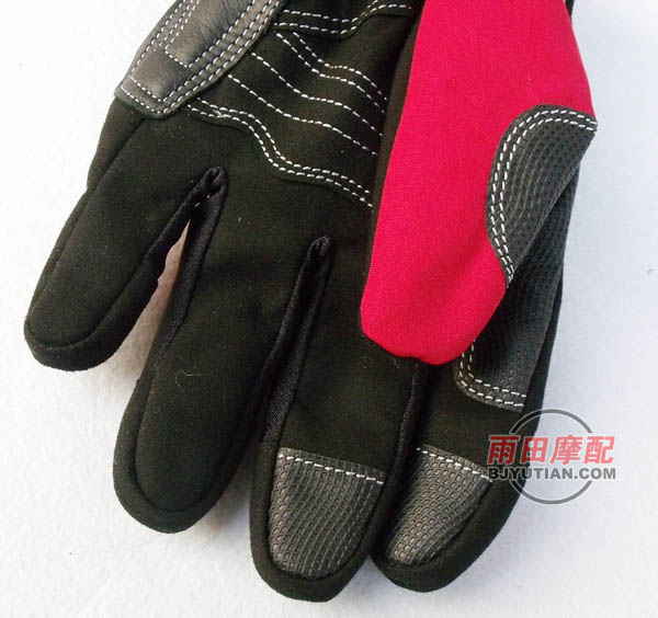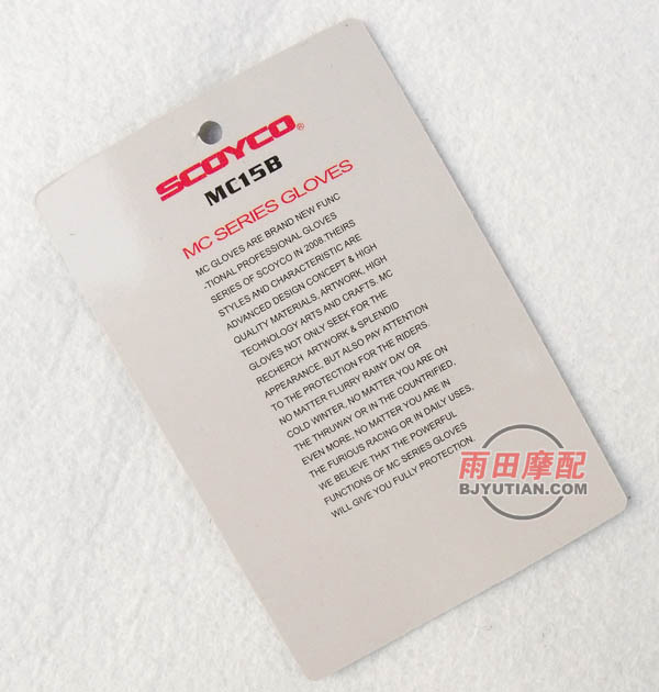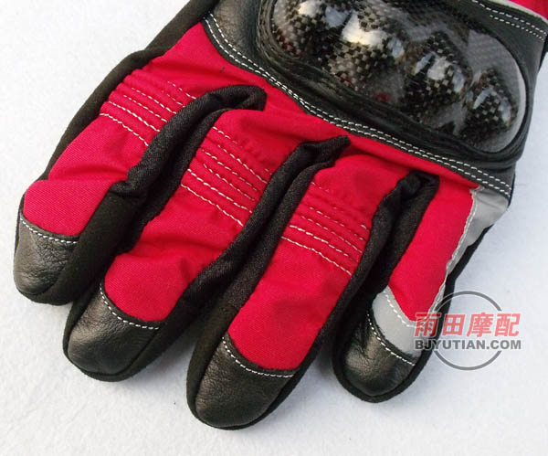 【特 点】:MC15B在07款MX15防水、保暖的基础上加强了其保护性能(加上碳纤维)的一款手套。主要材料为450D尼龙、碳纤维、塔丝隆、超纤、夹层采用COMTEX防水材料、手背处有反光材料。适合雨天、夜间骑行。手腕处有魔术贴固定;防滑设计,汽车、摩托车赛车、山地自行车等都可以佩戴。它不仅适用于竞争激烈的赛场,也适用于单车爱好者们日常的锻炼和出行