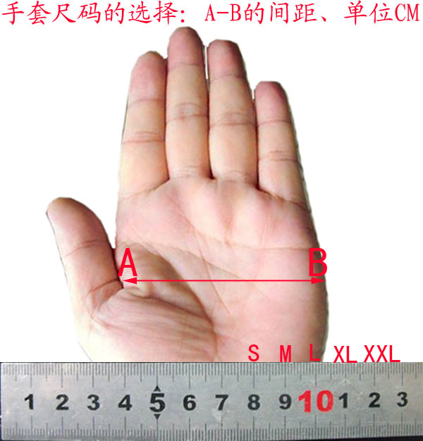我对手套尺码理解是 S=6.6---7.5cm、 M=7.6---8.5cm、 L=8.6---9.5cm、 XL=9.6---10.5cm、 XXL=10.6---11.5cm