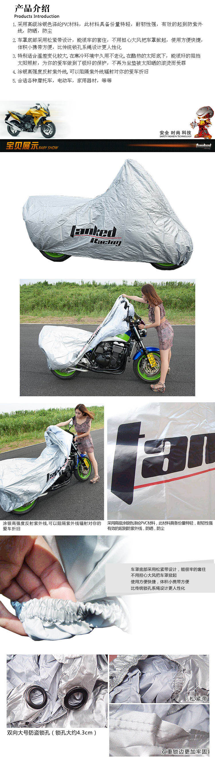 M号 (长203*宽89*高122)(125CC系列踏板摩托车及豪华型电动车)如果有尾箱的建议买L号 L号 (长232*宽100*高125)(150CC-250CC系列摩托及大型电动车) XL号(长246*宽105*高127)(CB400、CB1000、R1、R6等400CC及以上大排车用) 【特 点】:特别提醒、最近有多位车友反映坦克车罩防雨性能差强人意、请您谨慎选择、谢谢!!(需要什么颜色请留言、没有留言我们会随机发货)最新豪华加强版摩托车衣.采用高级涂银色涤纶PVC材料,此材料具备份量特轻,耐韧性强,有效的起到防紫外线,防晒,防尘、车罩底部采用松紧带设计,能很牢的套住,不用担心大风把车罩掀起,使用方便快捷,体积小携带方便,比传统锁孔系绳设计更人性化。特别适合温差变化较大,在寒冷环境中久用不老化,在酷热的太阳底下,能很好的阻挡太阳照射,为你的爱车做到了极好的保护,不再为坐垫被太阳晒的滚烫而受罪。涂银高强度反射紫外线,可以阻隔紫外线辐射对车子的漆面损坏、适合豪华跑车及太子车使用