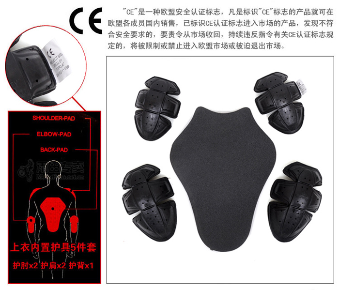 | 款式名: | | 颜色: | 黑色 | 尺码: | XS-3XL | 特点: | 两层结构,高密涤纶以及网眼面料,网眼具有良好的透气功能,3D护具 | 外面料: | 涤纶0.3cm珍珠格提花牛津布+ PU 涂层, 通风绳网 | 加强/装饰部位: | 凸纹提花牛津布 | 单里: | 为增加透气性减少内里 | 防雨里: | 无 | 衣兜: | 2个外兜 | 可拆卸保护垫: | 肩、肘:3D双层保护垫,后背XPE保护垫 | 功能: | ·选购材料符合欧盟环保(SGS)出口标准; ·网眼具有良好的透气功能 ·网眼设计,提高穿着凉爽度;