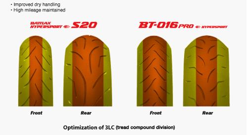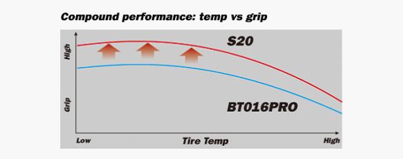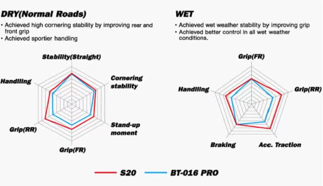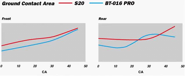 让所有倾角的行驶中,皆能藉着保持宽敞有效触地面积,来增进其立马的抓地效果。 l 由于S20优化了宽敞的触地面积之胎体结构,使其前后轮于任何倾角的行驶中,所表现的抓地效果皆优于BT016 PRO(请参考示意图)。
