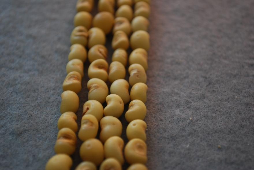 24、天台豆,为浙江天台山独有特产,树木所结种子。状如大偏豆?呈黑色,质地坚韧。据说有驱邪之功能。去天台山者都不会忘记购买用天台豆所制成的佛珠。