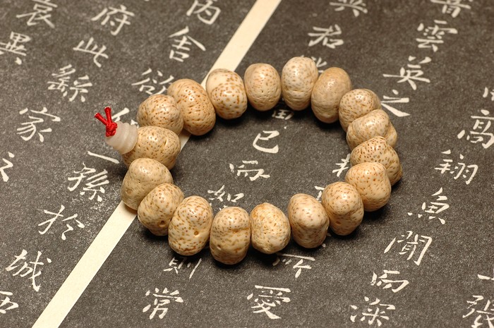 1.白玉菩提,学名油棕,因质地手感类似白玉而得名,非常光滑,温润。因为此树成材极慢,开花结果都需要数十年的时间,非常珍贵。文理清晰,每一颗上面都有种子发芽的芽眼。