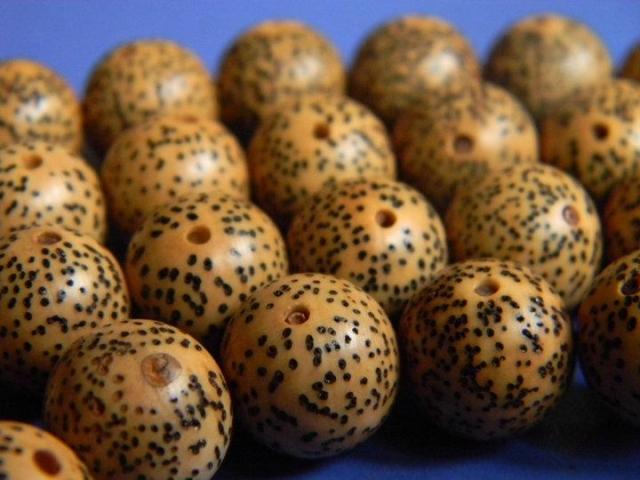 14、星月菩提,是一种较稀有的植物,质地坚硬,星月菩提外形是乳黄色菩提子珠面布有均匀的黑点,中间有一个凹的圆圈,状如繁星托月,故名星月菩提。被称为世界"四大名珠"之一。