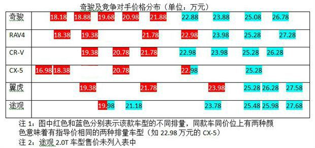 一方面,东风日产将新奇骏的起步价定在18.18万元,较大部分竞争车型18.38万元的起步价明显降低。尽管厂家在实际排产过程中会有意控制供货,但这使新奇骏在宣传上占据一定优势。另一方面,新奇骏的车型分布,使其在20万~26万元这个中级SUV核心竞争区间内几乎做到每万元内都有一款车型。