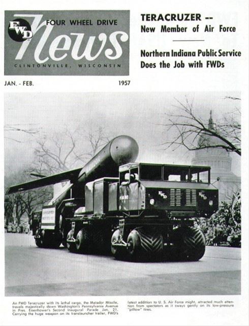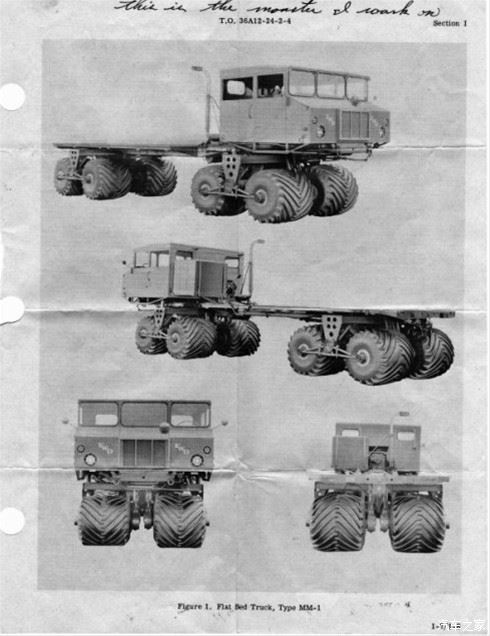 先简单介绍一下这个50年前的高科技,现在看着也极富科幻感有着抢眼奇葩悬挂的东西。FWD MM-1 Teracruzer重型载具。FWD,Four Wheel Drive(四轮驱动),MM-1,为其在美国空军的编号。Teracruzer,意为使用Terra轮胎(terra-tires)的载具。在此时,苏联红军的一直发展各型号的重型地对地以及空对地的重型导弹武器。而运载发射这些对美军以及欧洲安全的“红色战斧”的载具,是美军所不具有的。在此大环境下,美军运用其强大的机械、汽车制造能力,开发出Teracruzer载具。