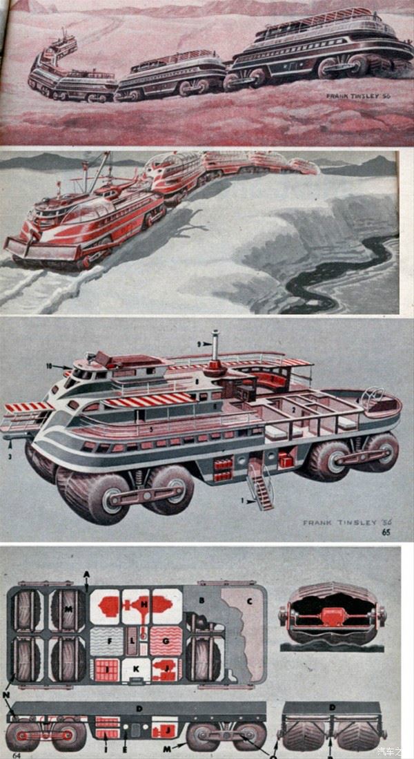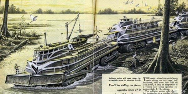 许多人为这种极具革命性的的发明设想了许多美妙的用途。包括这种豪华“陆地旅游巡洋舰”,Frank Tinsley 在1957年2月的《Mechanix Illustrated》杂志上刊登系列猜想图。