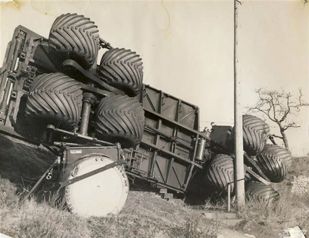 奇葩的悬挂引人注目,前轮悬架四个为一组进行转弯,并能手动调节将转向架调成倾斜状态以越过大的障碍物。从这张罕见的车祸照片可以看下其大概结构。