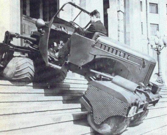 详细说下它的轮胎。所有轮胎的气压也能进行调节以适应不同的路况,公路时高气压,沙地、泥泞时低气压。载具的名称Teracruzer,或者拼写为Terra-cruiser,意为使用Terra轮胎(terra-tires)的载具。首先说一下Terra轮胎(terra-tires),这种轮胎是由威廉·阿尔比在1951年发明的,据说是受到因纽特人把海豹皮充气放雪橇下滑行的启发。这种轮胎是一种超低压拱形轮胎。这种轮胎在承受负荷时,与地面接触的中心部分向内弯曲,使软土密集在接触面中心,从而增大了接触面积,使之对地面的单位压力小,一般适用于联合收割机及越野行驶的汽车。以下几图为使用这种轮胎的一些车辆。威廉·阿尔比在他的车库里建立的第一个原型机。