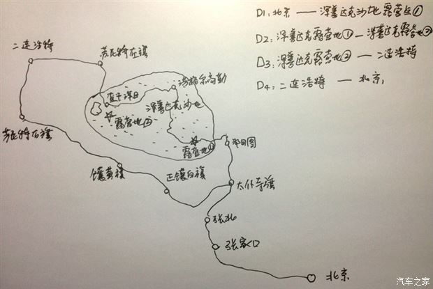 举世瞩目的北京APEC召开,对于生在京城的百姓来说,最大的烦恼也不过是单双号限行而已,但换来如同天上掉馅饼般的六天假期,这不得不让人大大惊喜一番,就这一项,我愿意每年一次APEC,不光有蓝天,更有轻松享受蓝天的假期陪伴。 立刻出发,临时决定一路向北,至于到哪里,走什么线路都不重要,只要在路上,一切都不是问题啦。 这次四天三夜共2000公里路程,其中前两晚均在浑善达克沙地内露营,这是LD第一次跟我尝试在冬季户外露营,辛苦程度超出她想象,不过,得到的欢乐也是巨大的。 这是整个行程线路图,仍然沿袭我儿童绘画水平的路书风格。