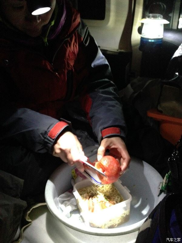 入夜时分,寒风刺骨,与LD赶紧钻进车内,我的阿虎后座早已拆除改装成一辆标准床车,由于布置合理,内部空间可以让我俩在从容就餐。车外风声呼啸,车内却有泡面腾起阵阵热气,第一天,补给充足,还有果蔬配餐,吃完半躺着还玩了会手机,当时间接近8点,车内温度陡降,赶紧钻进被子,这次为了冬季露营,准备了大厚棉被各一床,一条毛毯做压脚,在最上面还有一床棉质睡袋做为防风防水用,即便如此,还是如同在冰箱内一般,LD用护脸将脑袋保住,我则用一条秋裤将头蒙住,这个时候,为了保暖,身边一切都要利用起来,尽管武装到牙齿,后半夜依旧浑身冰凉,全身缩在被子中不敢动,周围好似全都是冰块无法触碰了,就这样一直等到冬至第一日的第一缕阳光射进车窗。