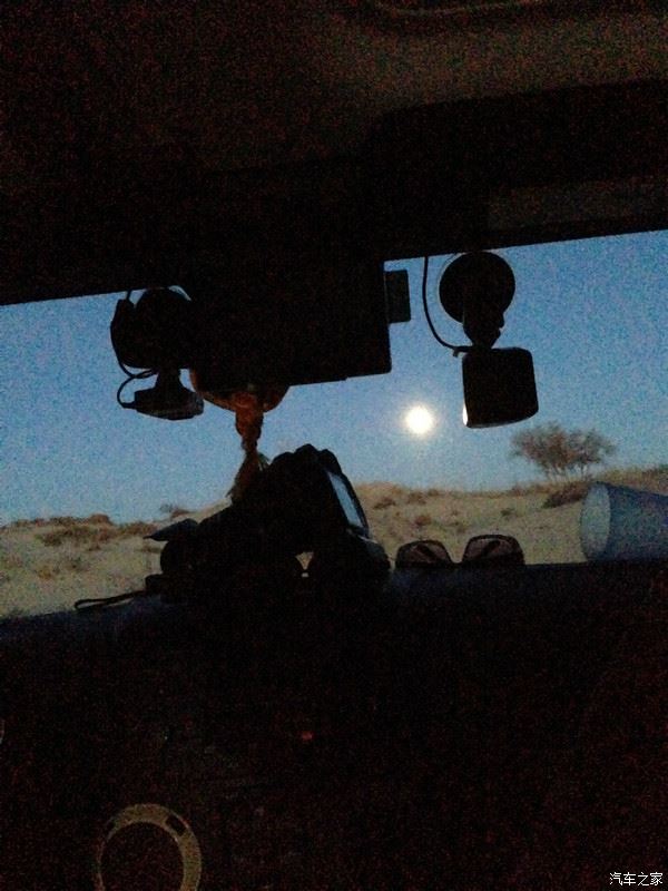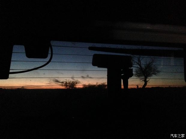 美景短暂,仅仅十分钟,周围顿时漆黑一片,寒意袭人,连续露营对于人的意志是个大考验,非常担心LD坚持不下来或者因此生病,趁着车内还有些残存热气,LD冲了杯柠檬水,一口热水下肚,身上顿觉暖意,生火做饭无望,冷烧饼夹牛肉,配上一口热水,倒也吃的爽快,冬日沙地,温度下降极快,钻进大被子时,依稀还能看见残阳似火,其实,相比生活的艰苦,更愿意看到窗外的无限美景,让心情放松了不少。