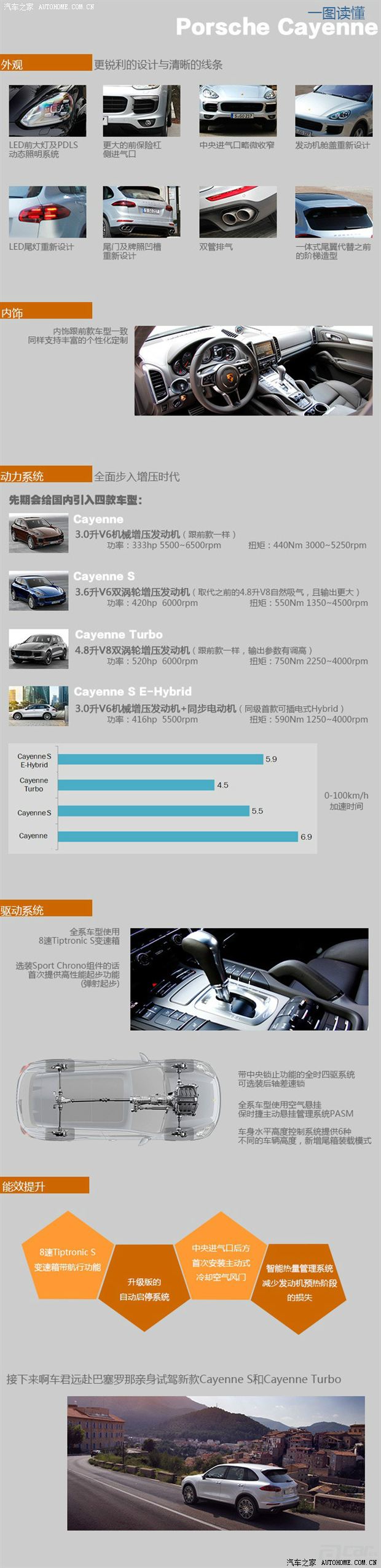 在新款Cayenne的造型设计上,可以看到不少国内用户喜见乐闻的变动,例如更加宽大锐利的前保险杠格栅,更有灵气的头灯(基本款和S版本配备双氙气大灯和"浮动"四点式LED日间行车灯,Turbo车型标配LED主大灯和保时捷动态照明系统PDLS)、更加简练的尾门。尾灯也经过重新设计,线条更清晰,比以往还要强调车身的宽度和贴地感。 一图读懂新款Cayenne