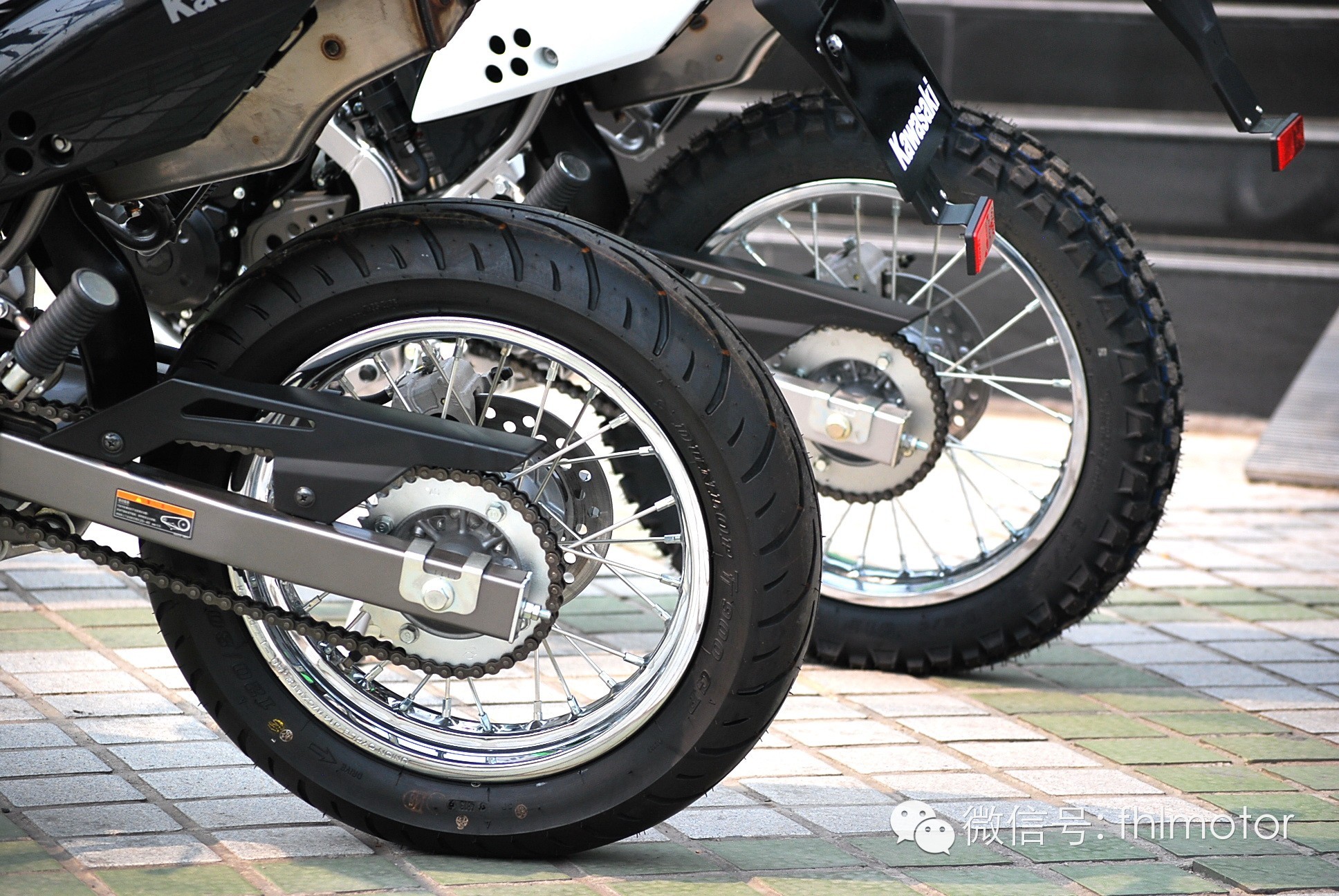 两车最大的区别在于轮胎,由于侧重的功能差异,KLX 150采用适合越野的越野的大尺寸轮圈和轮胎,而滑胎版则选用公路胎。另外,在前减震的配置上,KLX 150配备传统的正立式前叉,滑胎版则配备倒立式前减震,后减震则采用相同的中置减震。