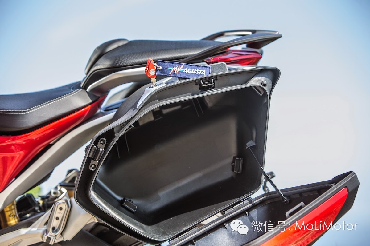 TURISMO VELOCE 800 TURISMO VELOCE LUSSO 800 的差异不大,只差在后者原厂搭配60升侧箱。TURISMO VELOCE 800 MV AGUSTA 希望让机车旅行上能有更多的骑乘乐趣而开发的车款,因此与多数全功能旅行车款不同,选择相对轻巧的直列三缸800cc 引擎,在拥有足够的扭力之下,仍有轻巧灵活的操控感。做为MV AGUSTA 家族中的最新车款,也同样搭配MVICS 2.0 电控系统、新一代的EAS 2.0 电子变速系统、防孤轮系统。另外还搭配最新的MV AGUSTA 底盘稳定控制(MV AGUSTA Chassis Stability Control, MVCSC)系统,是一套透过控制半主动悬吊的电子稳定系统,透过ECU 接收到的悬吊压缩与回弹的信息,整合全车行车状况,电子系统会介入进行悬吊阻尼的调整,让TURISMO VELOCE 800 在各种路况都有良好适应性。