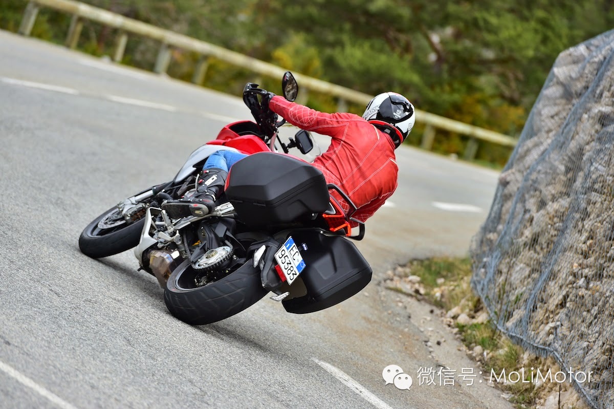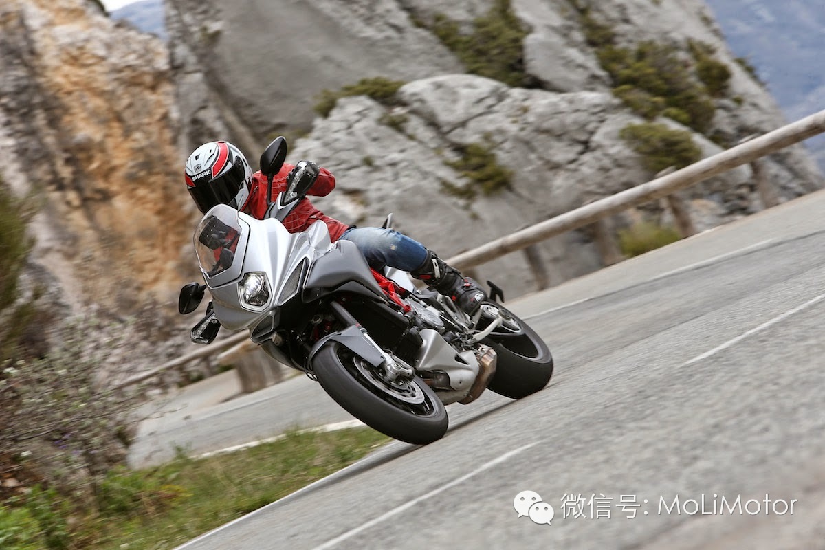 MV AGUSTA 此次在法国南部安排了230km的路程,我们在一天之内,以大约四小时的时间走完,路线主要是尼斯附近的山路,包含低速的连续弯道,中高速的上、下坡路段,这样的安排正是要突显VELOCE 所主打的诉求:操控乐趣。实际跨上车后,立刻能感受到850mm座高设定的骑乘视野,从数据上来看,850mm在休旅车款上也是属于较高,但VELOCE的车架设计与F3Brutale 相似(原厂表示是重新设计的)因此瘦窄的车身为高座高增添了点亲和力,以4450px的身高来说,双脚前端可同时着地,并不会有问题。油箱外型则延伸了MV 跑车的设计精神,而容量可以达到22公升,比一般的GSMulti 等各车款都还要大,仅小于GS Adventure 版本,也可以看出VELOCE 是有备而来的。骑乘的感受部分,则以下面几个重点和大家分享: