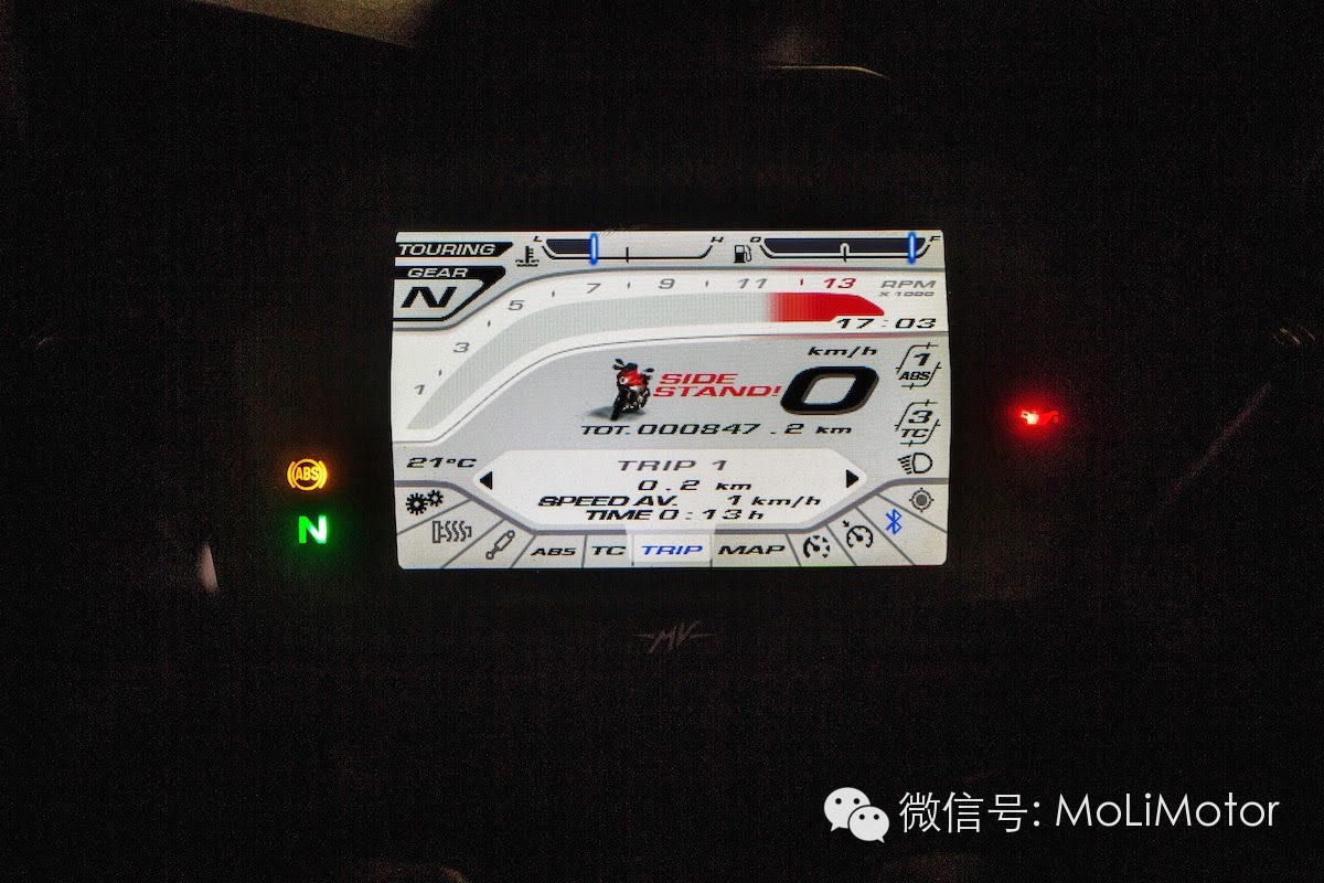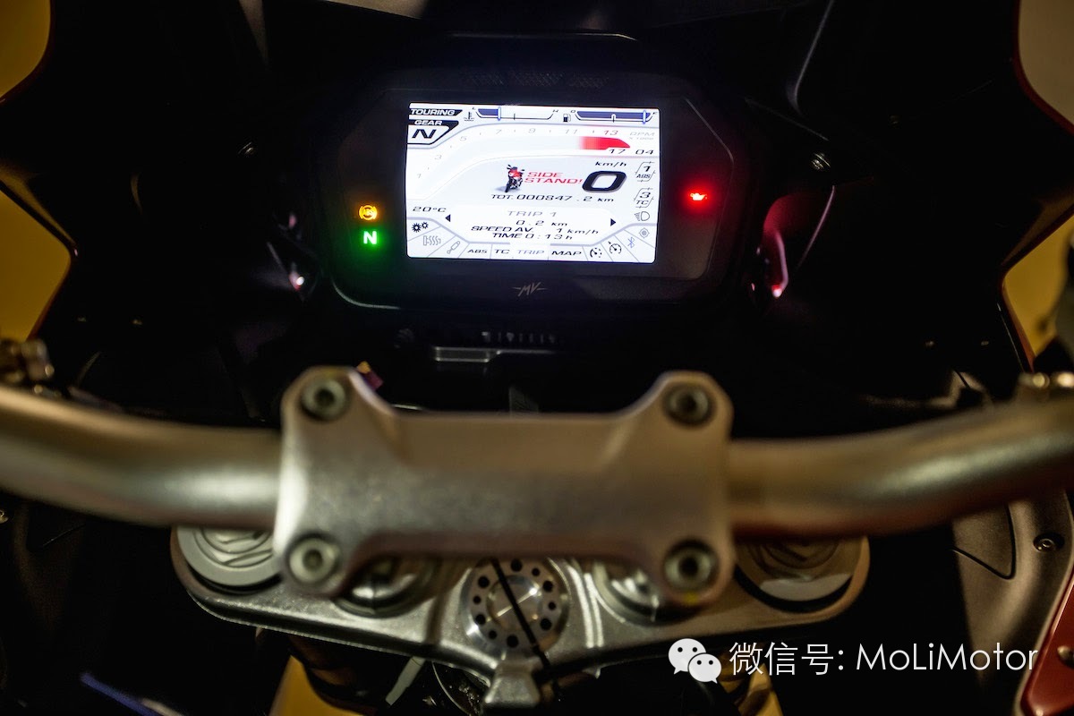 MVICS 2.0 的电子控制有三种默认模式(雨天、旅行、运动三种)加上自定模式可供骑士选择,首先要了解在不同的模式之下,油门敏感度、最大扭力、引擎煞车、引擎反应、最高RPM 转速都会不同。VELOCE 采电子油门系统,因此可以控制油门及实际节流阀的开度比例,在雨天模式之下,节流阀的开关会更为缓和、避免突然的扭力输出而造成打滑。例如在旅游模式之下,系统也会减轻引擎煞车,减少在关闭油门时,造成后座安全帽撞到骑士的机会,是非常贴心的设计!自定模式之下,骑士可以自行调整以上参数,找出自己喜欢的组合,有如基本的供油计算机调整。在试乘路线中,我以旅行模式出发,在熟悉车辆后改以运动模式(可在骑乘调整、但必须在油门关闭的状况下操作)明显感觉到油门敏感度提升,动力在转下油门的瞬间立即释放,乐趣瞬间提升。若以雨天模式骑乘,则除了油门敏感度降低之外,最大扭力、马力也均下修。