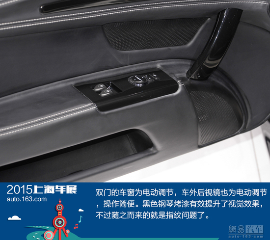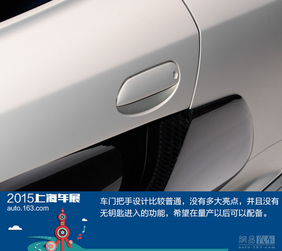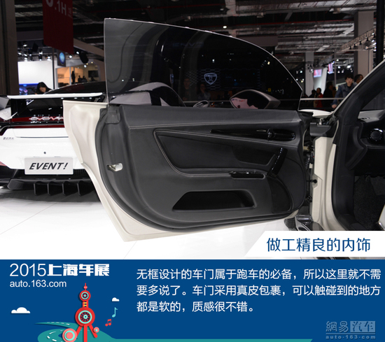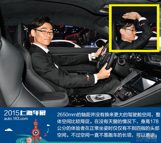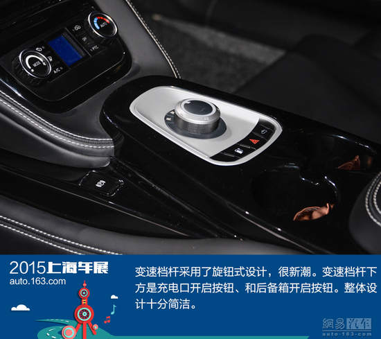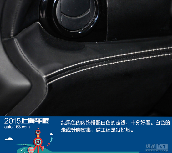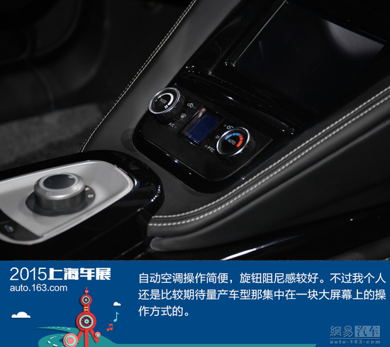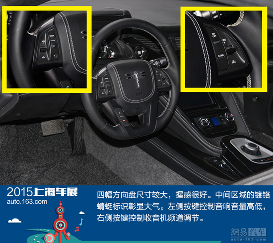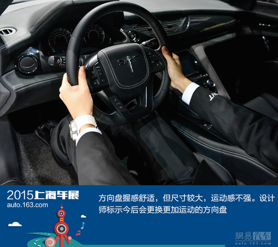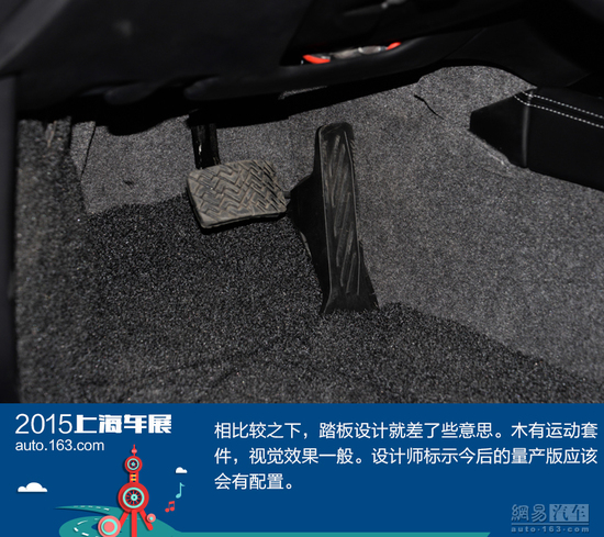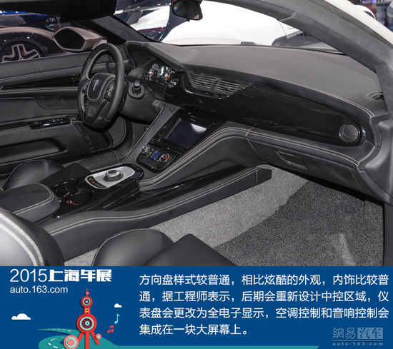 内饰部分: 做工还算精良,全黑的内饰充满运动感。前卫的旋钮式变速档杆设计十分炫酷。不过比起炫酷的外观设计,内饰的设计稍显平庸。不过好在设计师表示量产车会更换全新的内饰,力求配得上炫酷的外观。带有换挡拨片的方向盘握感良好,不过尺寸略大。