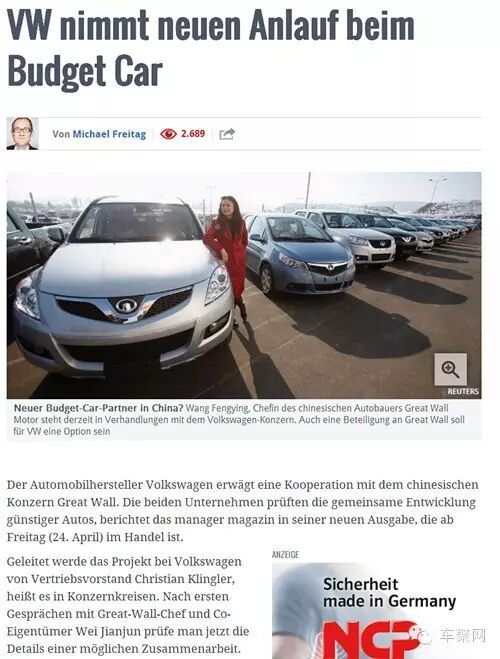 在德国,《经理人杂志》权威性很高,大众与长城洽谈一文的作者Michael Freitag是一名驻柏林记者。他之前曾报道过多起关于大众的独家新闻,后均被证实属实。因此可推断,此次大众接洽长城的消息也有较高可信性。