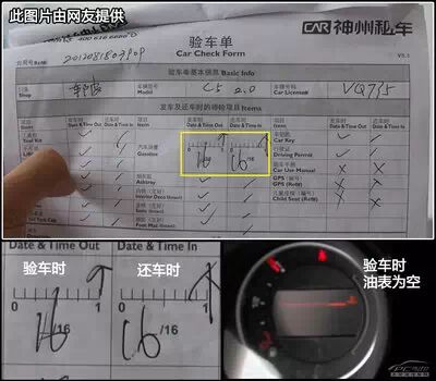 车主林先生提供证据说,验车时,其实油量为空(“好在当时我已拍照留证”),但是验车人会很随意的在油量上标记为满格,所以还车时我则非得把油加满,要不就的扣除所耗油费。(以下为林先生提供的验车单证据)