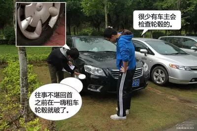 验车时千万别漏掉了检查轮毂,因为轮毂的赔付费用比较高,如果还车时发现轮毂损伤,而又并非你所为,你就只能吃哑巴亏了,拍照留底是最好的办法。