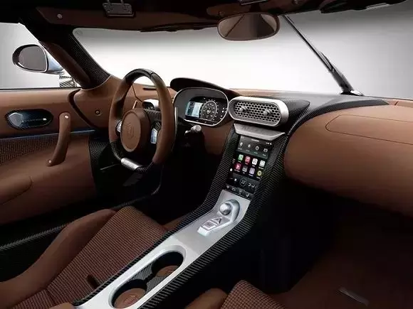 在Regera内部,你将惊喜地看到一个极其现代化且富有高科技色彩的驾驶舱。位于中控台中央的是一个硕大的信息娱乐显示屏,该显示屏兼容苹果公司的Carplay功能,另外还有车载Wi-Fi系统。