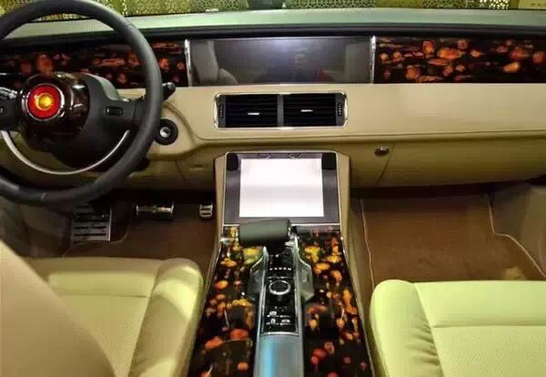 以中国传统的“如意”为主题,讲求“平衡对称”之美,同样追求“简洁、大气、庄重、典雅”的神韵。其中,中控区仪表板和副仪表板整体采用“大如意”造型风格,中间镶嵌一块全数字液晶仪表,达到古典与现代的完美结合。同时,前后车门内把手,造型成四柄“小如意”,各镶嵌一块云龙纹白玉,寓意“事事如意”