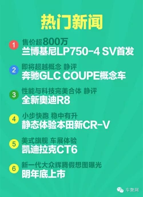网友对豪华车的关注热度同样也反映在了热门新闻排行榜上,《售价超800万兰博基尼LP750-4 SV首发》列总排名第一位,意大利超级跑车的魅力由此可见一斑。紧随其后的文章是《即将超越概念静评奔驰GLC Coupe概念车》、《性能与科技完美合体静评全新奥迪R8》同样是来自豪华品牌的高档新车。名列第四位的是《小步快跑稳中有升静态体验本田新CR-V》,体现了新浪网友对SUV车型的追逐热度。第五、第六位分别为《美式旗舰车展体验凯迪拉克CT6》与《新一代大众辉腾假想图曝光明年底上市》两篇文章。