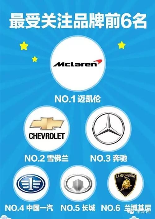 豪华品牌依旧是网友关注的热点领域,在最受关注品牌前6排名中,迈凯伦毫无悬念登顶第一的位置,加上奔驰、兰博基尼这两家品牌,前六排行榜中豪华品牌占去三个名额。而中国一汽与长城入围前六,则让人看到了自主品牌前行的希望。