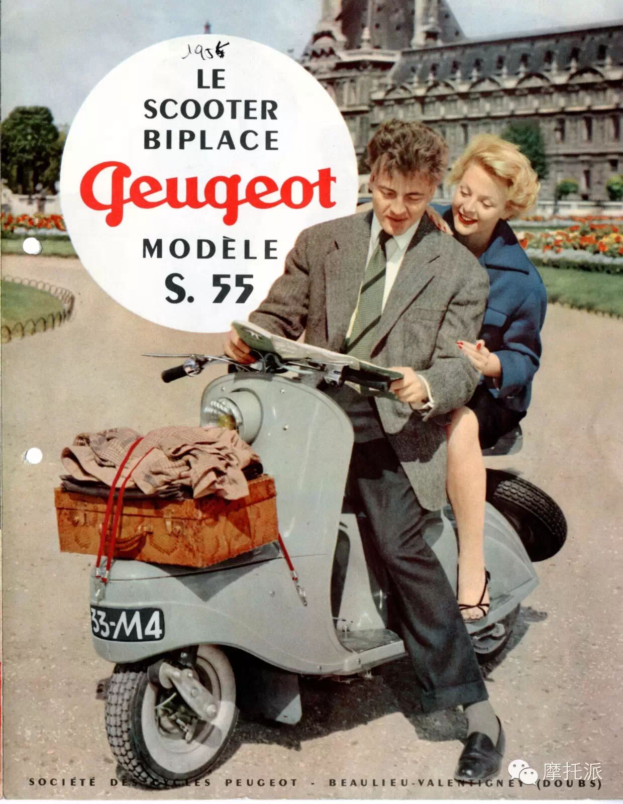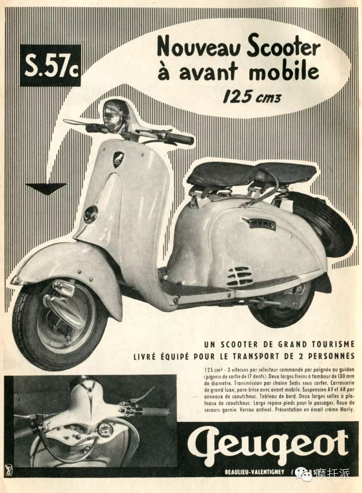 1953年,在法国博览会上,标致展示了第一辆双座式小型踏板车S55。它搭载125cc发动机,车身用钢板全封闭,外观沿袭当时标致203汽车的流线设计风格,其完美的配置可与汽车媲美。之后S57、S57AL、S57B、S57C等版本相继上市。