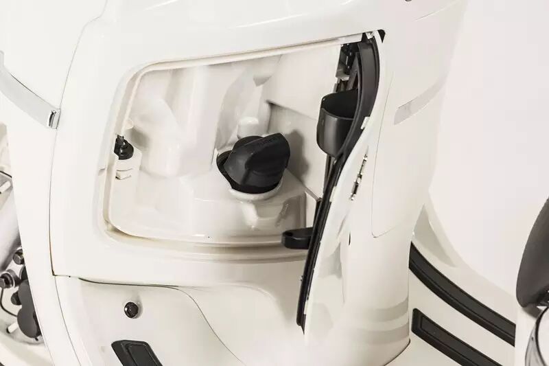 内挡风留有两个可锁式隐形储物箱。左侧的储物箱有加油口,右侧的储物箱配置12V充电接口,内部配置多种规格挂钩,贴心创意空间。