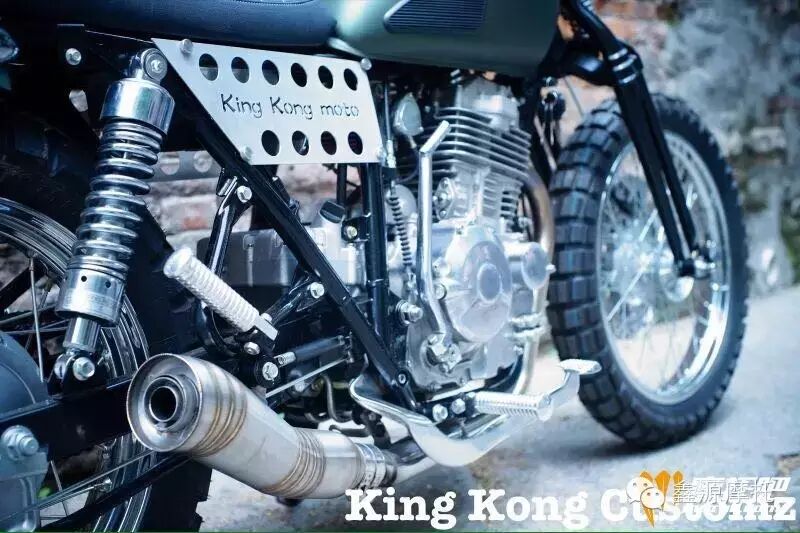 整体的配色以暗色为主,掏空中间可以减轻车体本身的重量。线路上从整体出发把线路尽可能的集成到一起,在视觉上减少多余感,利用祼把 进一步的简化视觉。为了能让油箱和座垫达到水平,切除原后架,重进行了焊接,减震也减少回弹距离。排气在选择上其实范了好多难,在更换了多个排气后,总体感觉选择这个吼管,虽然该管的焊接太过于明显而且在视觉上也更突兀,但好处是给人带来的那种机械感比较大并且在声音上也更象是越野车了。”