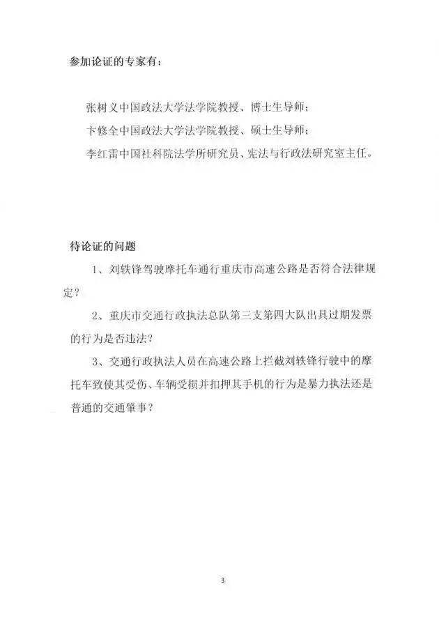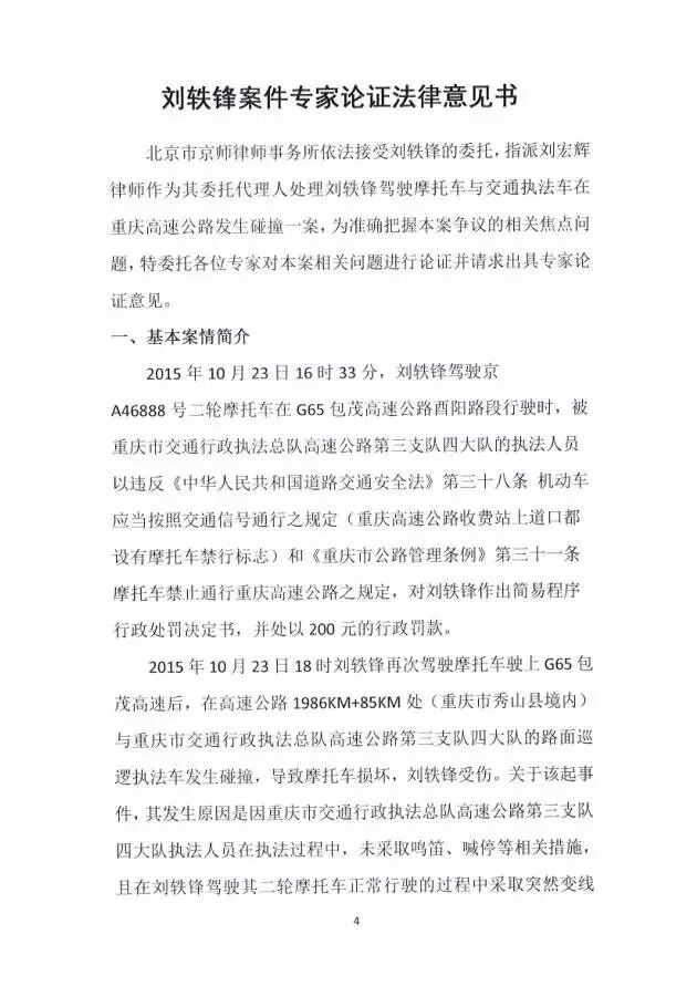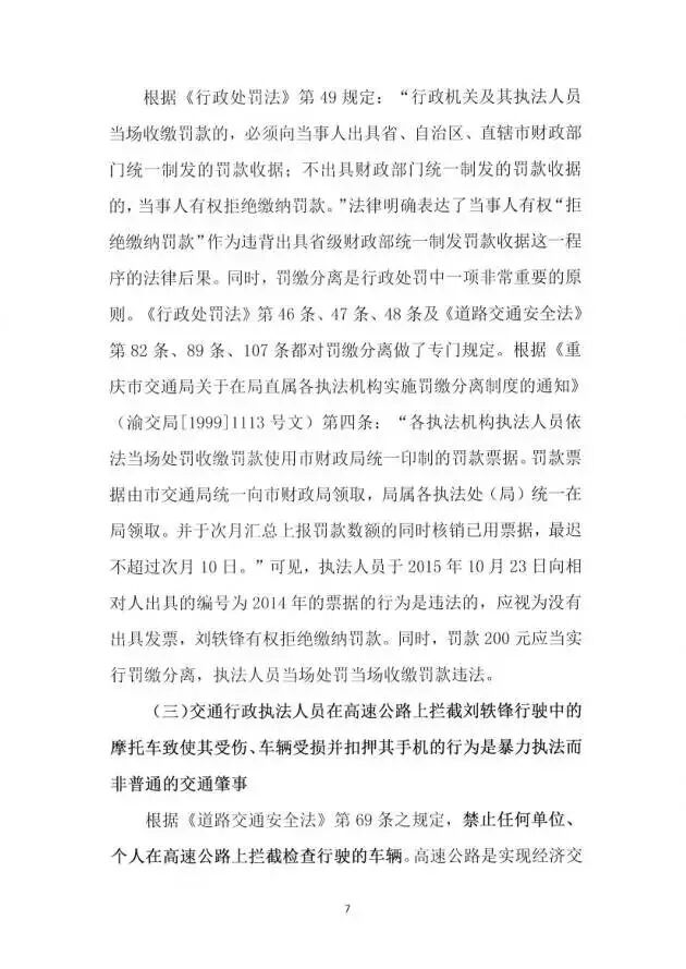 大师兄刘轶锋的律师团队认为,首先刘轶锋可以驾驶摩托车上高速,根据国家相关法律,重庆高速公路执法者禁止刘轶锋有驳于《立法法》,所以刘轶锋可以上高速。其次,刘轶锋的律师团队认为,执法人员拦截刘轶锋正在行驶的摩托车致其受伤并扣押手机等行为时暴力执法行为,并非普通的交通肇事。根据以上两条认为,执法人员应该承担事故全部责任。