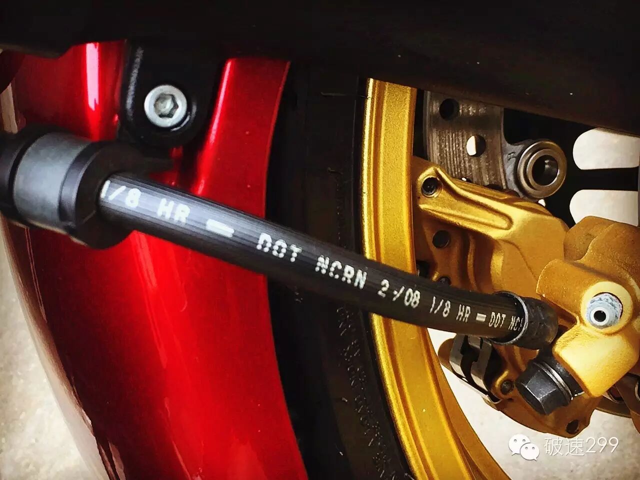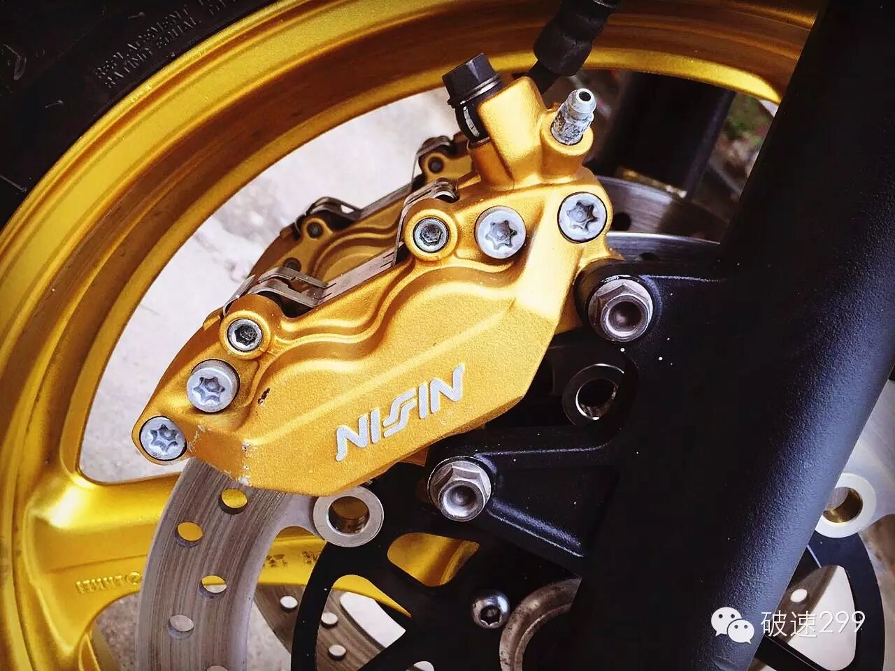 在前后制动系统方面,采用了nissin的鲍鱼,前面配备对向四活塞搭配296mm的双碟盘,后面配备单活塞卡钳搭配240mm单碟盘。这样的配备,在破速实际测试中制动效果和质感都非常不错