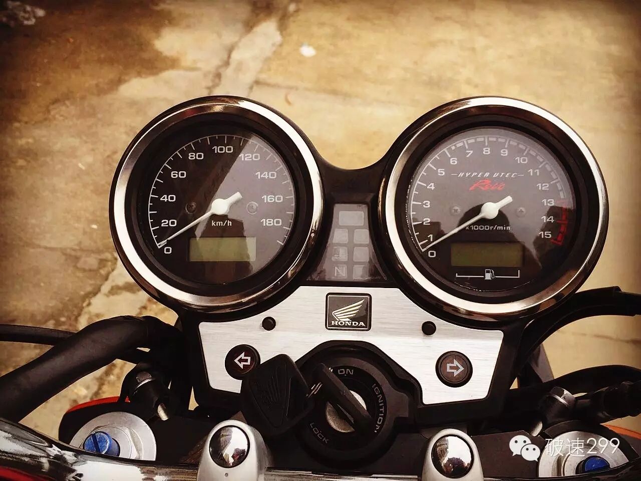 在仪表方面,相较于上一代,仪表中央的指示灯从原来的五个变成了七个,显示的信息更加丰富,hiss的芯片防盗让小偷想死的心都有了,仪表的信息一目了然。简洁明了,唯一不足的是它到现在也没有配备液晶式的速度表(也许是为了保持CB400SF的原汁原味吧)