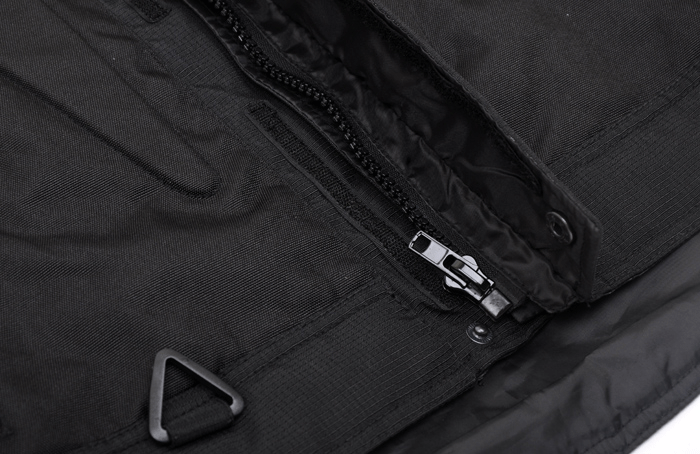 ·胸部外兜的防水拉链,下兜盖板用于固定的钮扣和下摆三角环挂钩均方便使用;