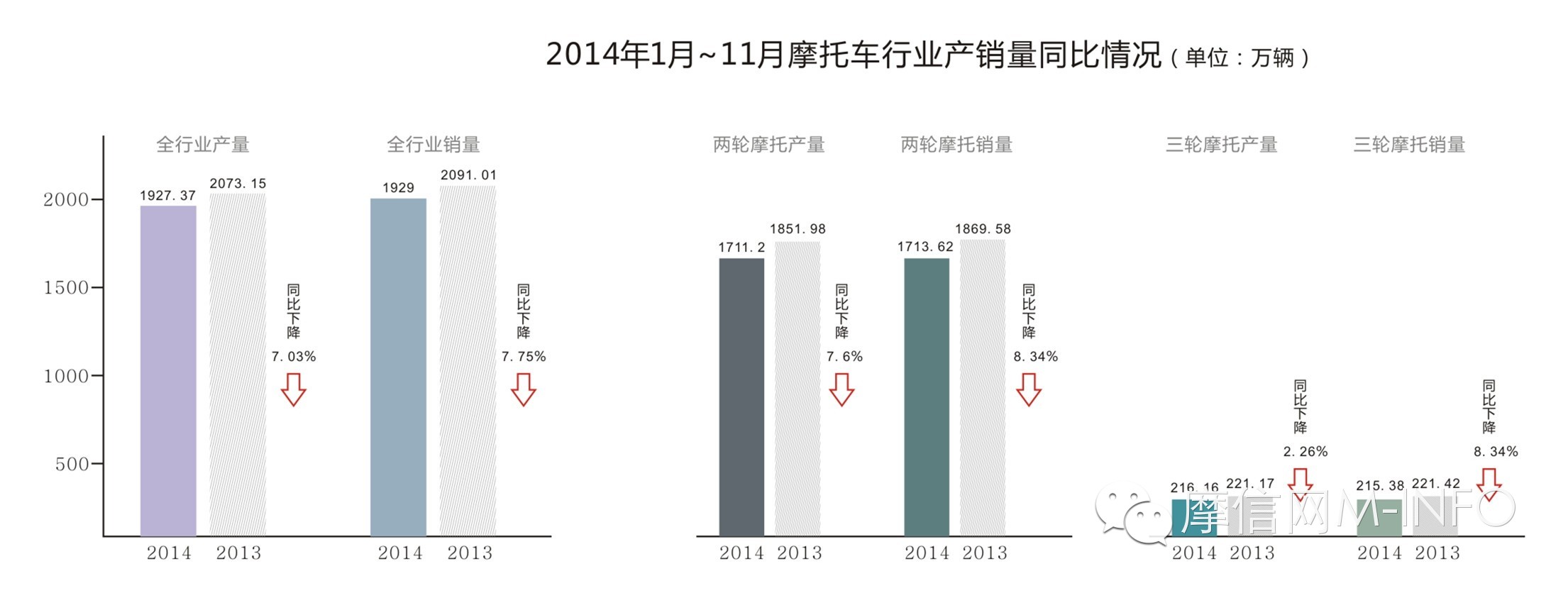 行业持续下滑对于摩托车行业来说,2014年仍然算不得一个好年份。连续几年以来的下滑趋势,在这一年仍然没有得到扭转。2014年我国摩托车行业共完成摩托车产销2126.78万辆和2129.44万辆,同比下降7.08%和7.59%;摩托车发动机产量2522.62万台,同比下降3.61%。其中,摩托车内销1271.06万辆,同比下降8.48%。严峻、紧迫、压力,成为每一个摩托人共同的感受。