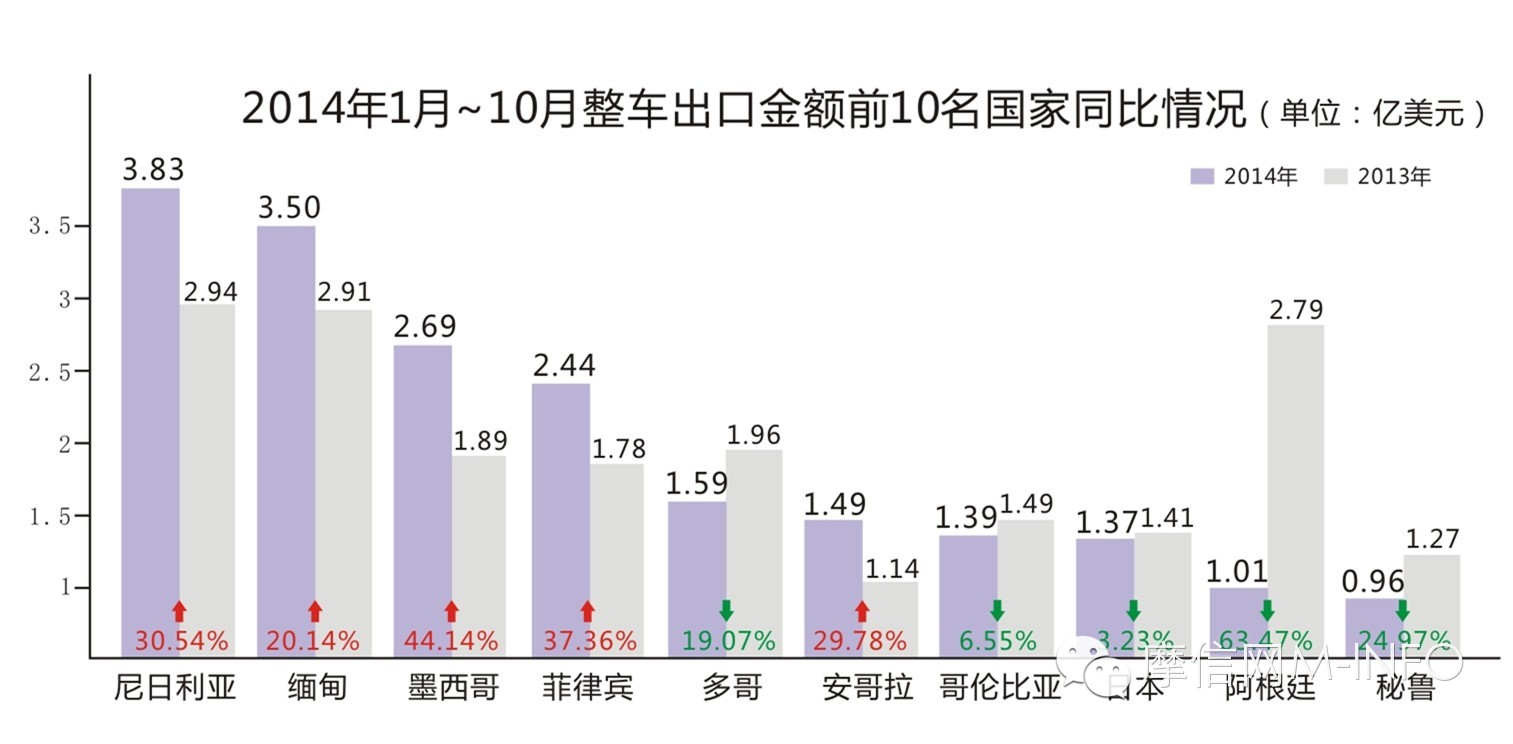 [size=2.7em]在内需不振、国内市场逐渐缩小的形势下,海外市场成为很多摩托车企业大力开拓的重点。前几年,海外出口市场一直呈现上扬趋势,但随着竞争压力的增大,2014年摩托车的出口市场也开始遭遇滑铁卢,出口量和出口金额都不同程度地下滑。2014年1月~10月,我国摩托车类商品(含整车、发动机、沙滩车、零配件)共计出口了75.52亿美元。其中整车出口7737971辆,同比减少6.75%;出口金额41.59亿美元,同比减少5.89%。从地区上看,整车出口值排名前10 的国家和地区分别为:尼日利亚、缅甸、墨西哥、菲律宾、多哥、安哥拉、哥伦比亚、日本、阿根廷、秘鲁。其中,尼日利亚、缅甸、墨西哥、菲律宾、安哥拉增长明显,同比增长率都在20%以上,尤其是墨西哥,出口值同比增长率甚至达到了44.14%。而多哥、阿根廷、秘鲁则呈现出较大的下降,阿根廷的出口值同比降幅甚至达到63.47%,下降趋势最为严重。虽然总体出口市场下滑,但企业出口前10名总体上表现出增长,出口市场的集中度呈现出提高的趋势。出口量排名第一的隆鑫,出口值同比增长了28.78%,五羊-本田的出口值同比增长27.13%,新大洲本田的出口值增长幅度最高,达到42.92%。此外,雅马哈、巴山、也有不同程度增长,大长江、豪进、力帆呈现出较小程度下降。从排量上看,100mL~125mL的摩托车仍然是出口的主力,2014年1月~10月出口量为431.6万辆,出口金额为21.76亿美元,出口金额同比增长1.93%,呈上升趋势,在全部车型中占据了52.33%的市场份额。其次为125mL~150mL的车型,出口值为9.12亿美元,同比下降14.6%,占据21.92%的市场份额。总体分析来看,我国摩托车出口产品仍然集中在中、低端摩托车,一直具有低廉性和同质性,低价成为企业出口竞争的最主要优势。随着日本逐步加强东南亚地区摩托车市场的竞争,以及印度摩托车逐渐向海外市场扩张,我国摩托车传统出口市场竞争加剧,出口形势日趋严峻。