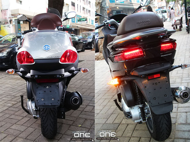 ●2015 (左)PIAGGIO 500ie LT Business及(右)300ie LT Business ABS ASR采用不同设计的排气管。