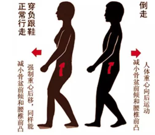 “倒走”的核心是通过改变运动方向来矫正重心,从而调整姿势,姿势不当者多重心靠前,反方向行走重心矫正到靠后,姿势就会好一些。倒走强制人体重心后移,矫正骨盆前倾和腰椎前凸,简便易行。